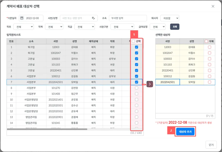 해당 계약서에 맞는 대상자를 추가하는 화면으로 상단 검색조건을 활용하여 원하는 기준에 대상자 확인 및 추가하여 등록합니다.