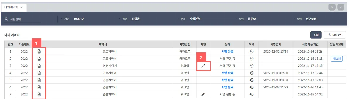 임직원들이 생성된 계약서를 확인하고 서명하는 화면입니다.