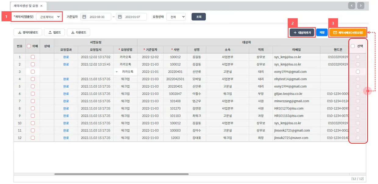 계약서 종류에 따라 원하는 대상자에게 서명요청을 배포하고 관리하는 화면입니다.