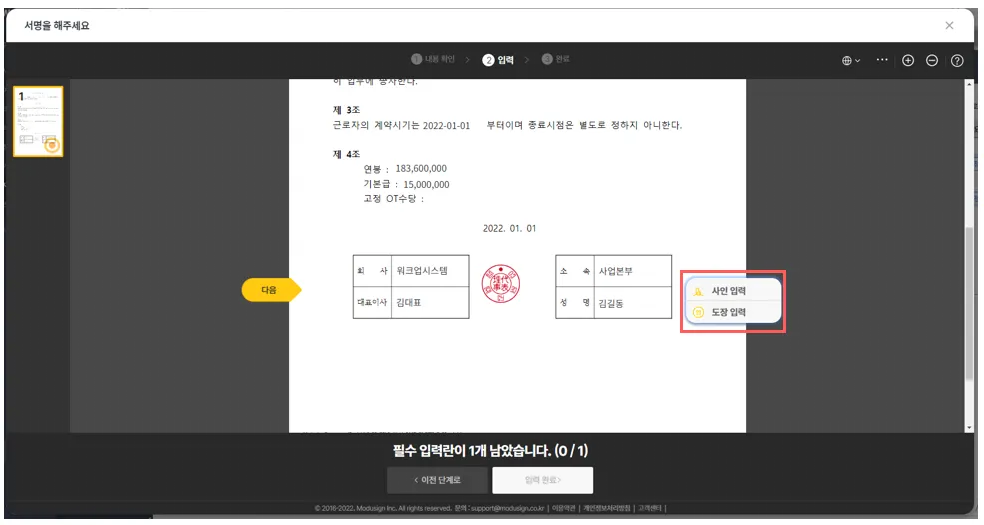 ② 선택된 계약서에 서명작업 진행