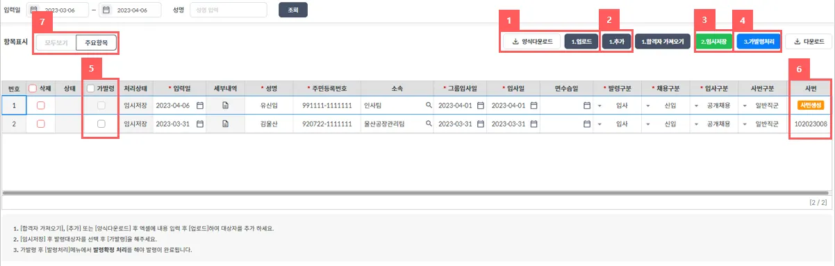 ③ 대상자의 성명, 주민등록번호, 소속, 입사일, 발령일등을 선택하고 임시저장