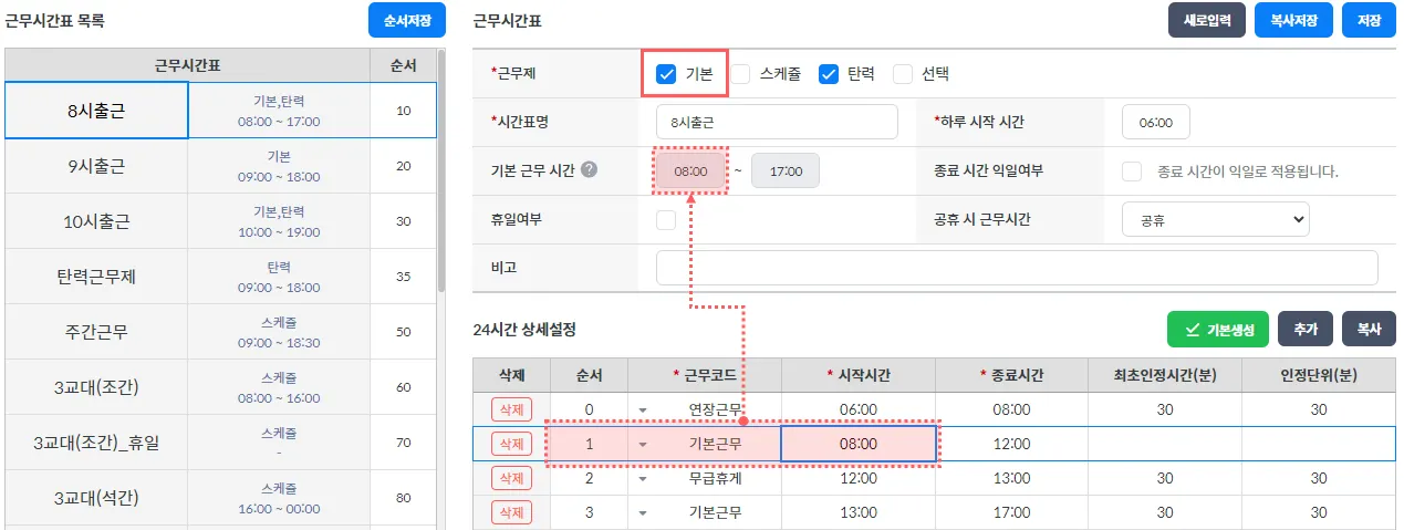 근무형태가 기본 근무일 경우 첫 번째 기본근무 시작 시간을 출근 시간으로 자동 저장됩니다.