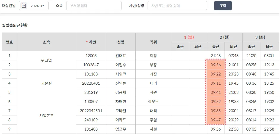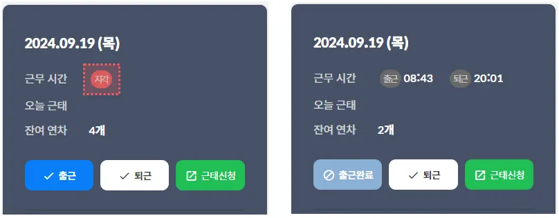 출근시간이 없거나 지각일 경우 음영처리되어 지각이 표시됩니다.