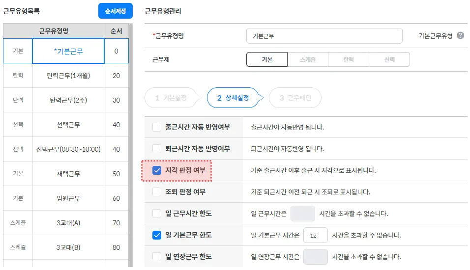 해당 설정으로 인해 화면에서 지각이 표시되며 개인별 근무스케줄이 ‘휴무’ 일때는 지각 처리를 하지 않습니다.