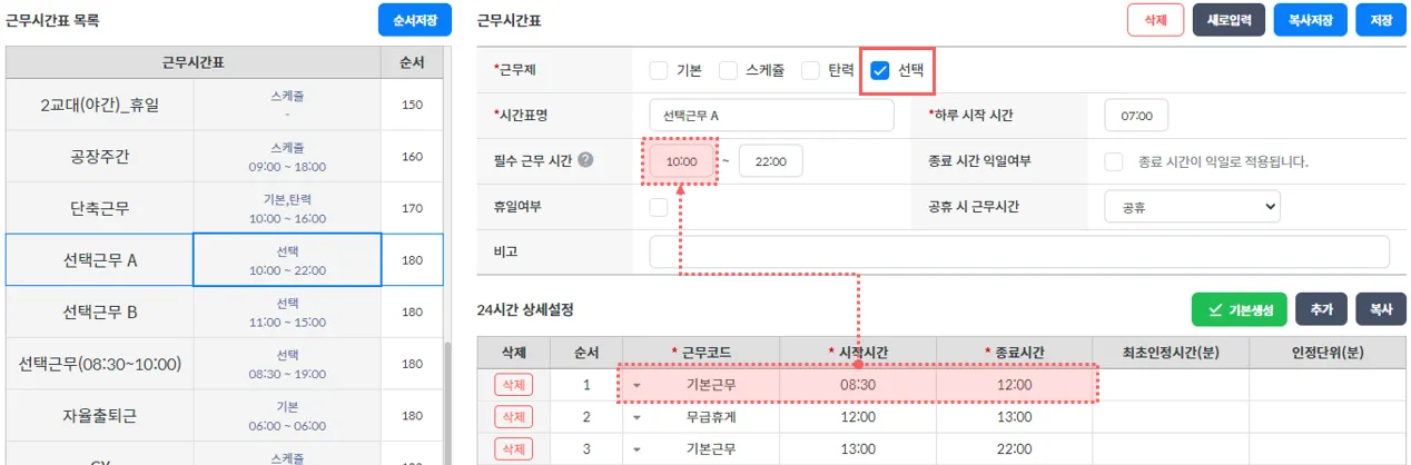 근무형태가 선택 근무일 경우 첫 번째 기본근무 시작 시간을 출근 시간으로 기본으로 가지고 오지만 필요에 따라 변경할 수 있습니다.