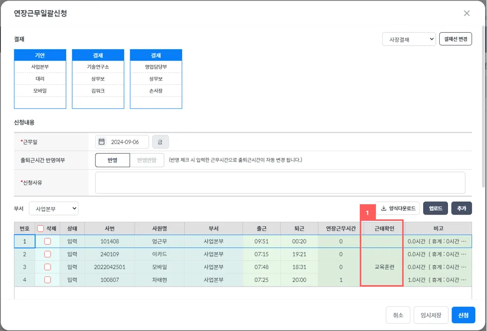 2. 연장근무일괄신청 - 근태 확인란 추가