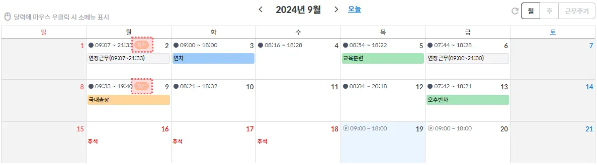 출근시간이 없거나 지각일 경우 캘린더에 지각이 표시됩니다.