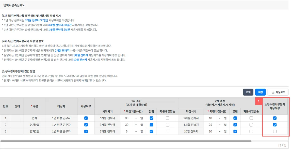 연차사용촉진 기준관리 화면으로 노무수령거부 통지 사용여부를 선택할 수 있습니다.