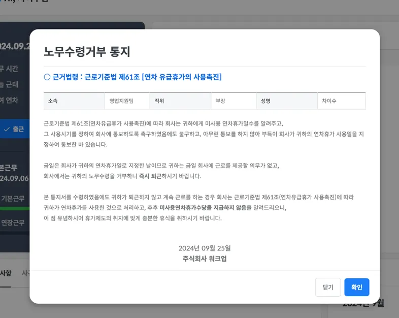 연차통보일에 출근하여 워크업에 접속할 경우 노무수령거부 안내 팝업을 띄웁니다.