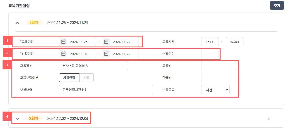 ③ 교육장소, 교육비, 보상내역등 기타 정보 관리