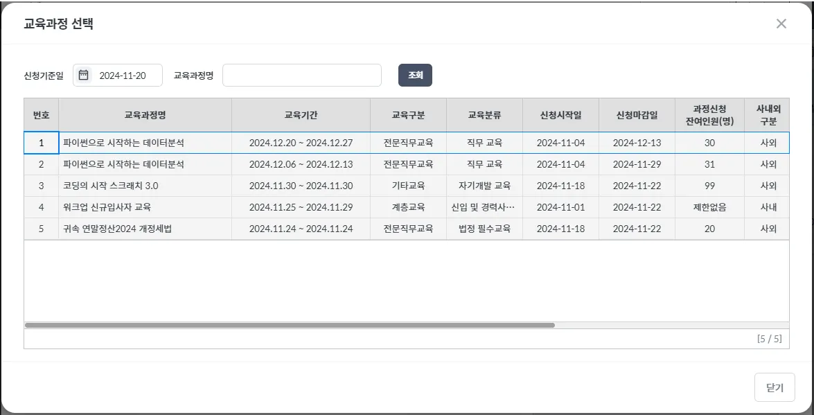 교육신청 : 교육신청과 승인과정을 통한 교육이력 (교육신청 상세 버튼이 활성화)