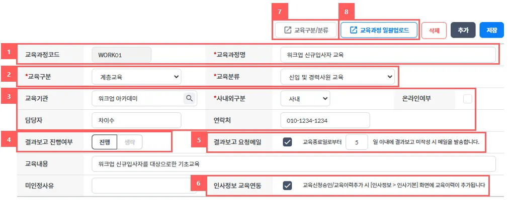 ⑦ 교육구분/분류 팝업에서 추가 및 수정