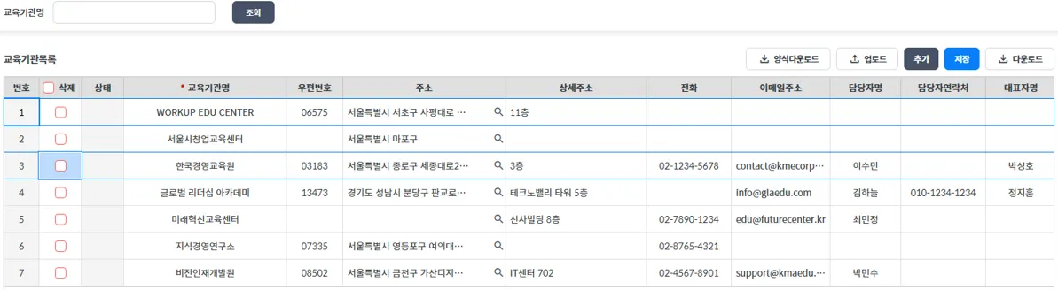 교육기관들의 기본정보를 관리하는 화면 입니다.