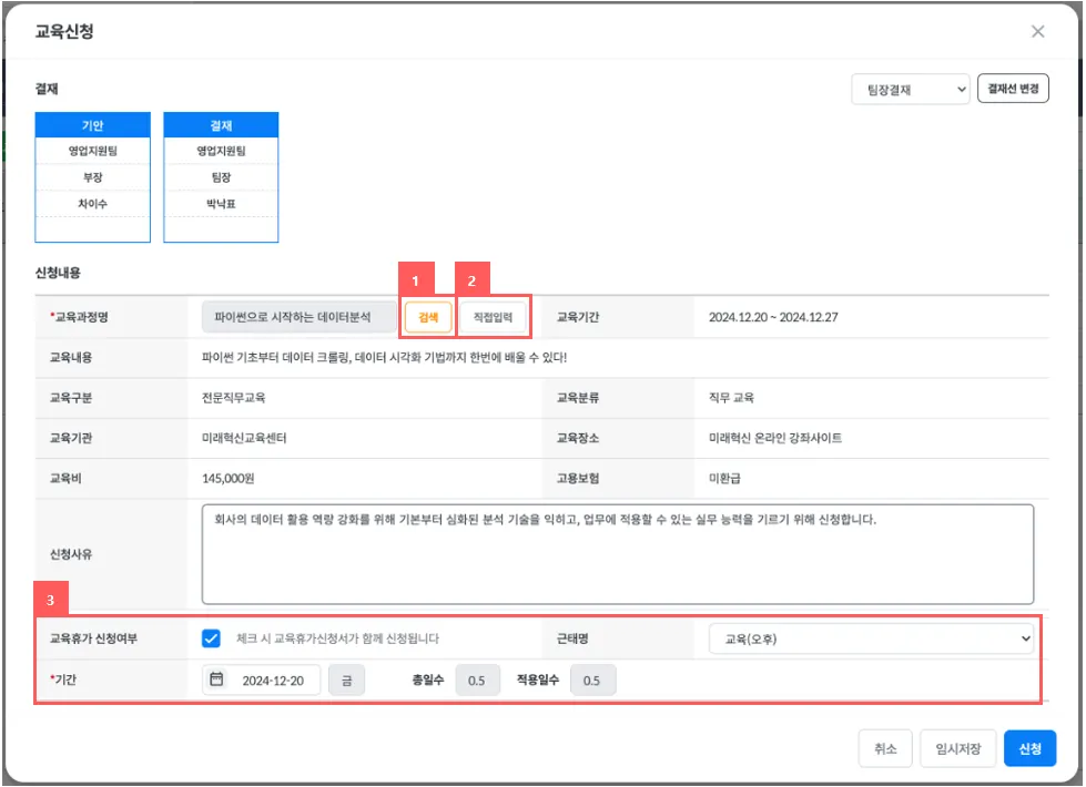 임직원이 교육신청 및 결과보고를 신청하는 화면 입니다.