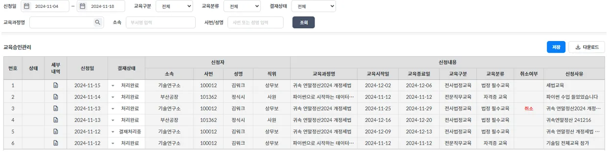 교육신청건에 대한 이력 및 승인내역을 관리하는 관리자 화면입니다.