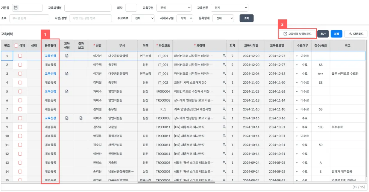 개별등록 : 교육신청 과정이 없이 담당자가 일괄 업로드 한 교육이력 (삭제버튼이 활성화)