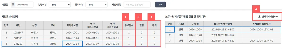 ④ 노무수령관련 열람 및 동의 이력을 전체 다운로드