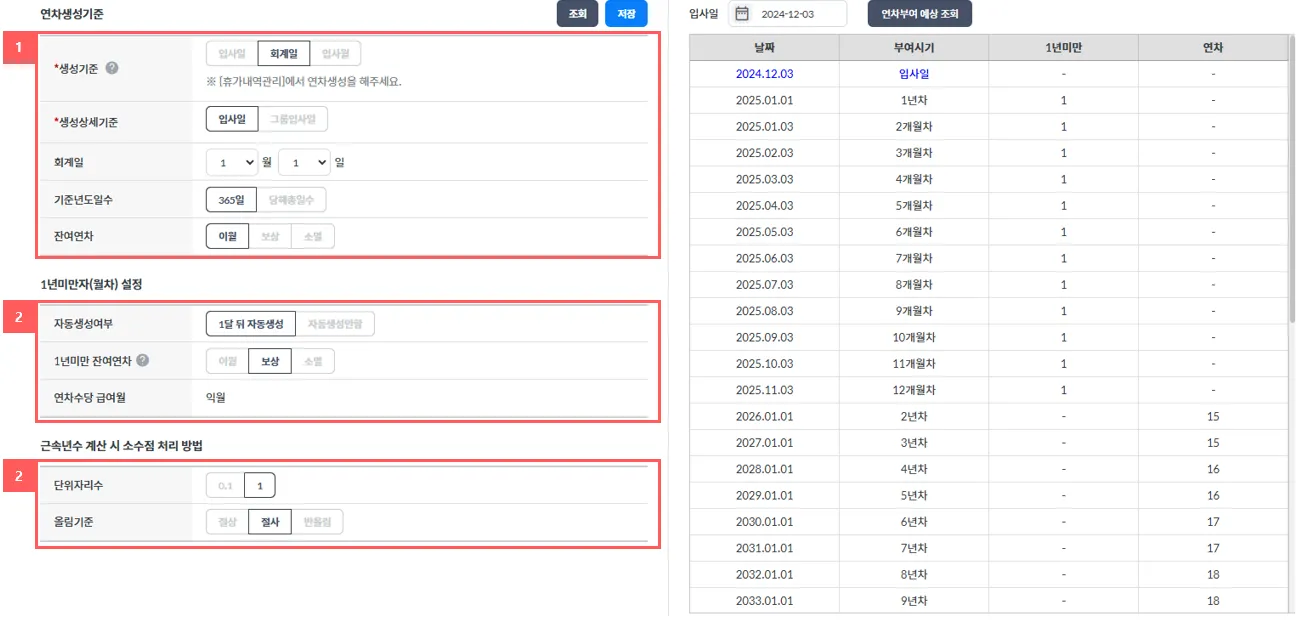 일반연차, 신입사원(1년미만)연차에 발생 기준을 설정하는 화면입니다.