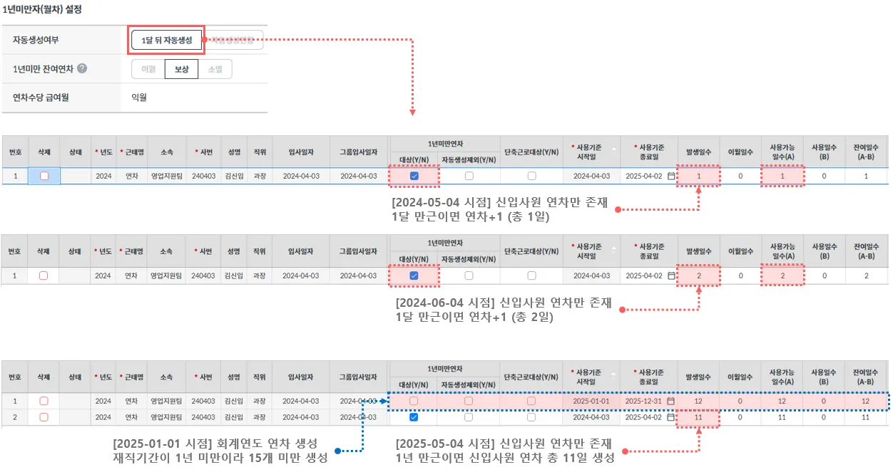 연차발생 기준 선택에 따라 예시는 달라질 수 있으나, 신입사원(1년미만) 연차 자동 생성 여부는 옵션에 따라서 작업됩니다.