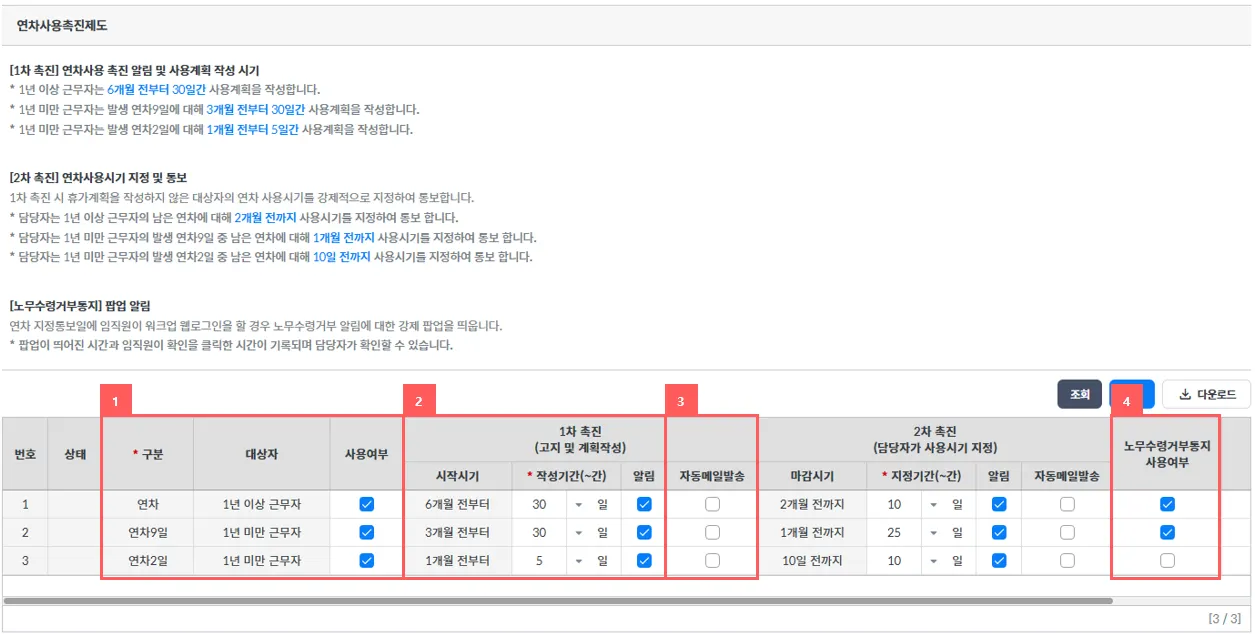 연차촉진 관련 대상자와 촉진시기등을 관리하는 화면입니다.