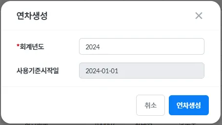 ③ 연차발생이 회계년도라면 연초 혹은 연말에 생성하기 위해 팝업 호출 (내년 연차를 미리 사용할 수 있기 때문에 필요시 선생성)