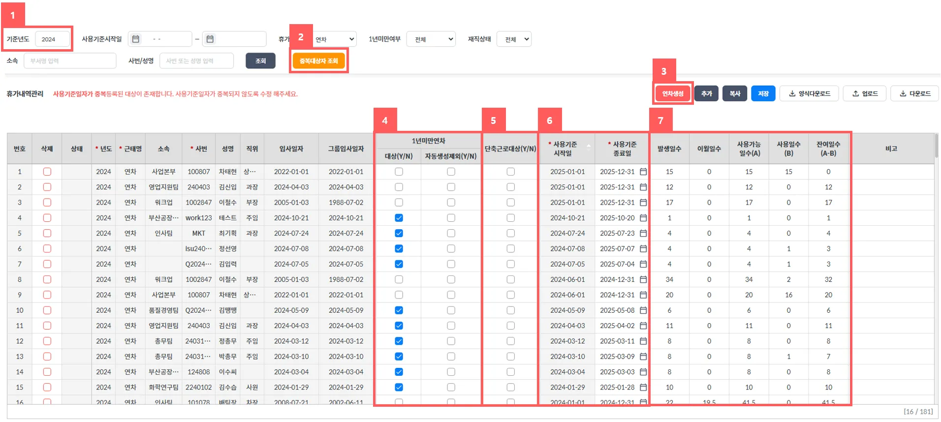 ⑥ 대상자별 연차의 사용 시작, 종료일 관리