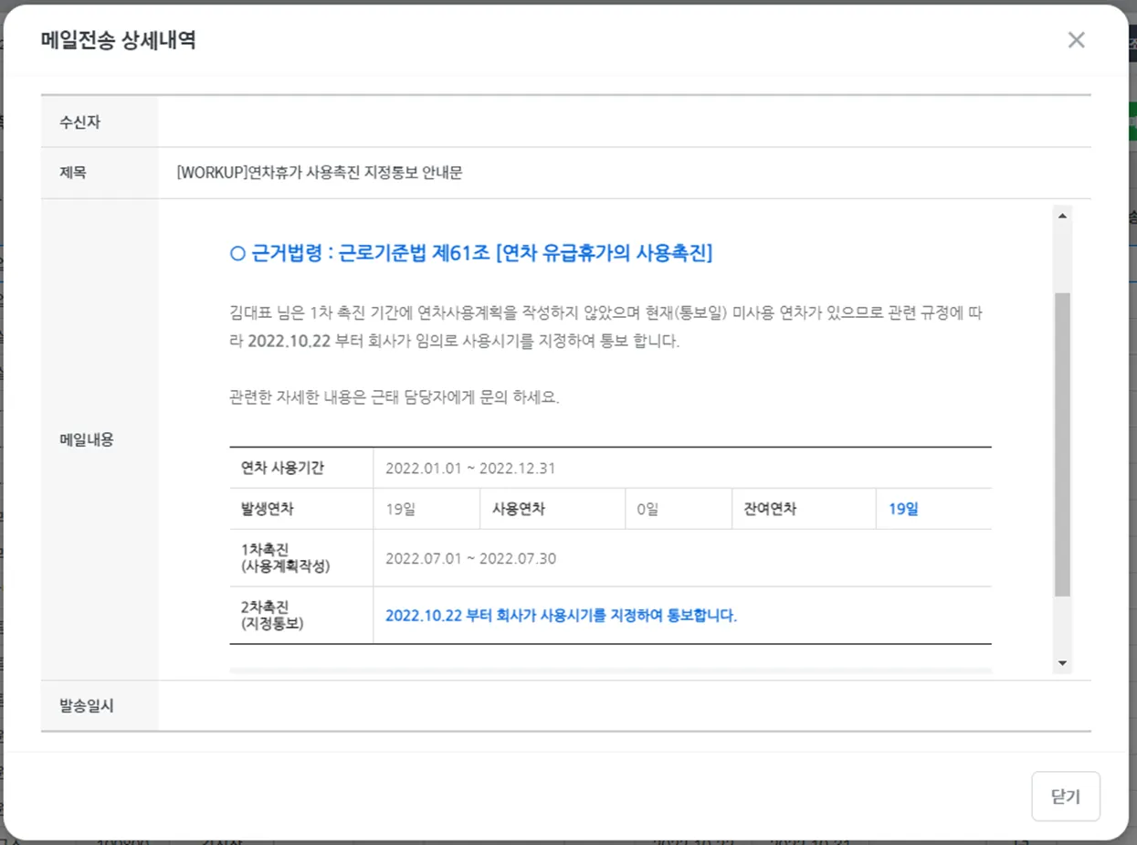 연차지정 통보일에 워크업에 접속해야지만 나오는 팝업으로 별도의 접속 없이 개별적으로 근무했을 때는 확인이 어렵습니다.