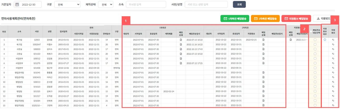 연차사용 촉진 대상자를 관리하고 메일발송하는 화면 입니다.
