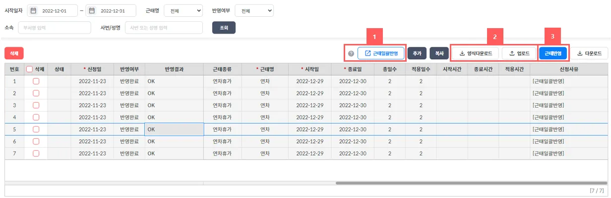 ③ 최종 업로드 작업이 끝나면 근태반영을 통해 일괄 적용