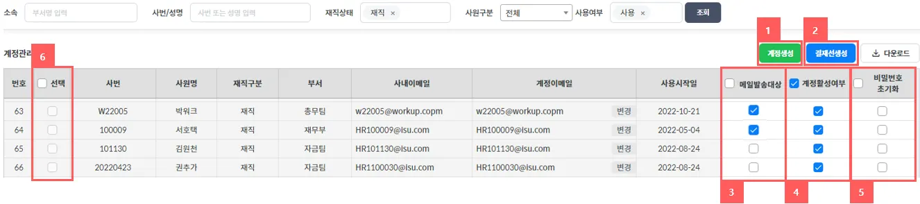 ⑥ 메일발송대상으로 체크되어 있을 경우 대상자들을 선택하여 계정생성 혹은 결재선 생성 작업을 진행