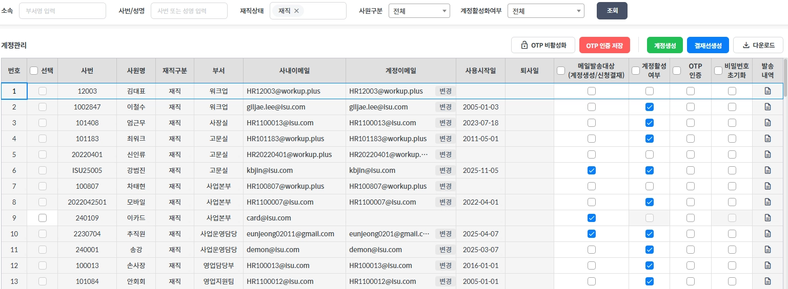 임직원 정보 생성 이후 로그인 할 수 있는 계정을 관리하는 화면 입니다.