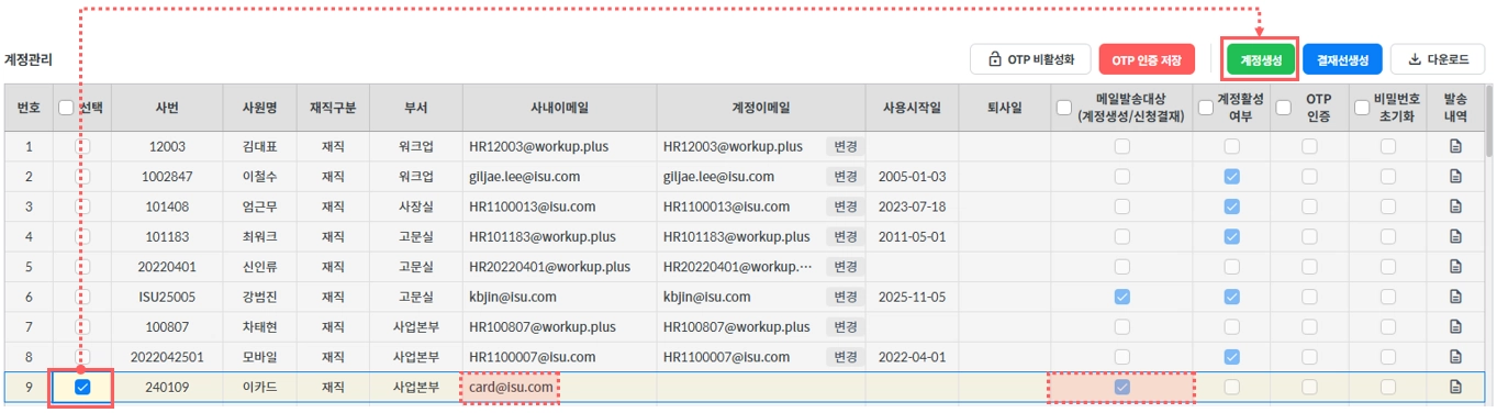⑥ 메일발송대상으로 체크되어 있을 경우 대상자들을 선택하여 계정생성 혹은 결재선 생성 작업을 진행