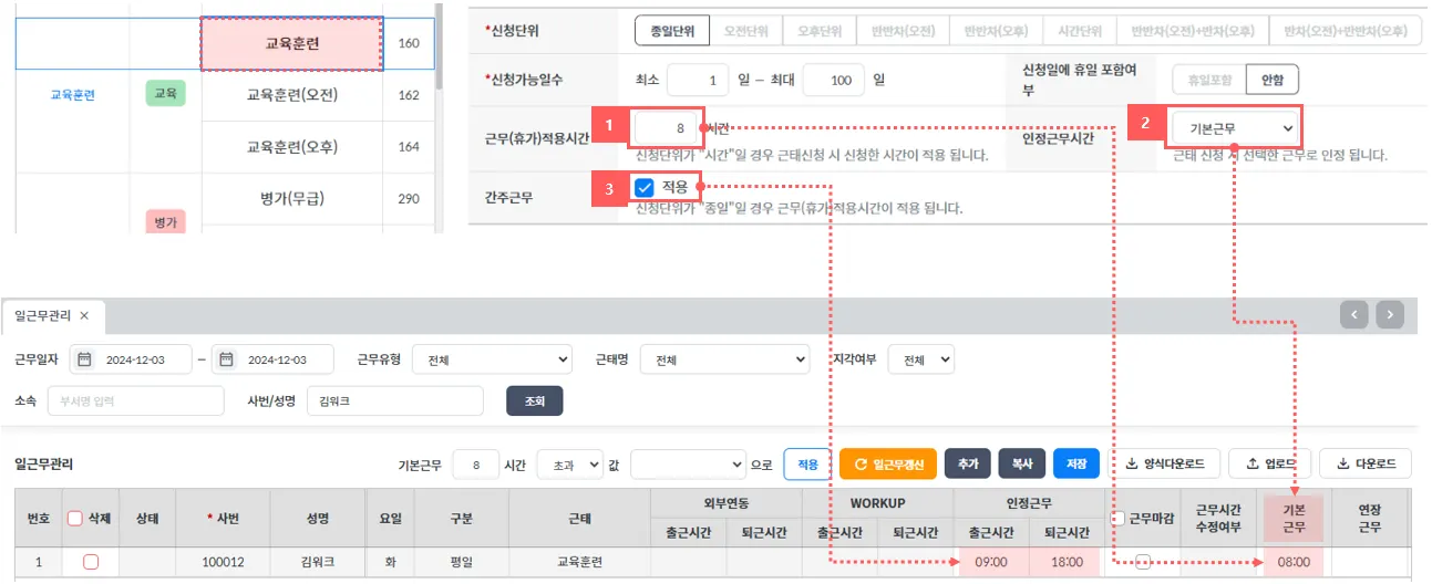 인정근무시간 : 해당 근태가 적용되는 인정근무 종류