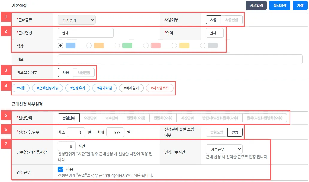 휴일 등록과 연차, 출장등과 같은 근태의 기본정보를 설정합니다.
