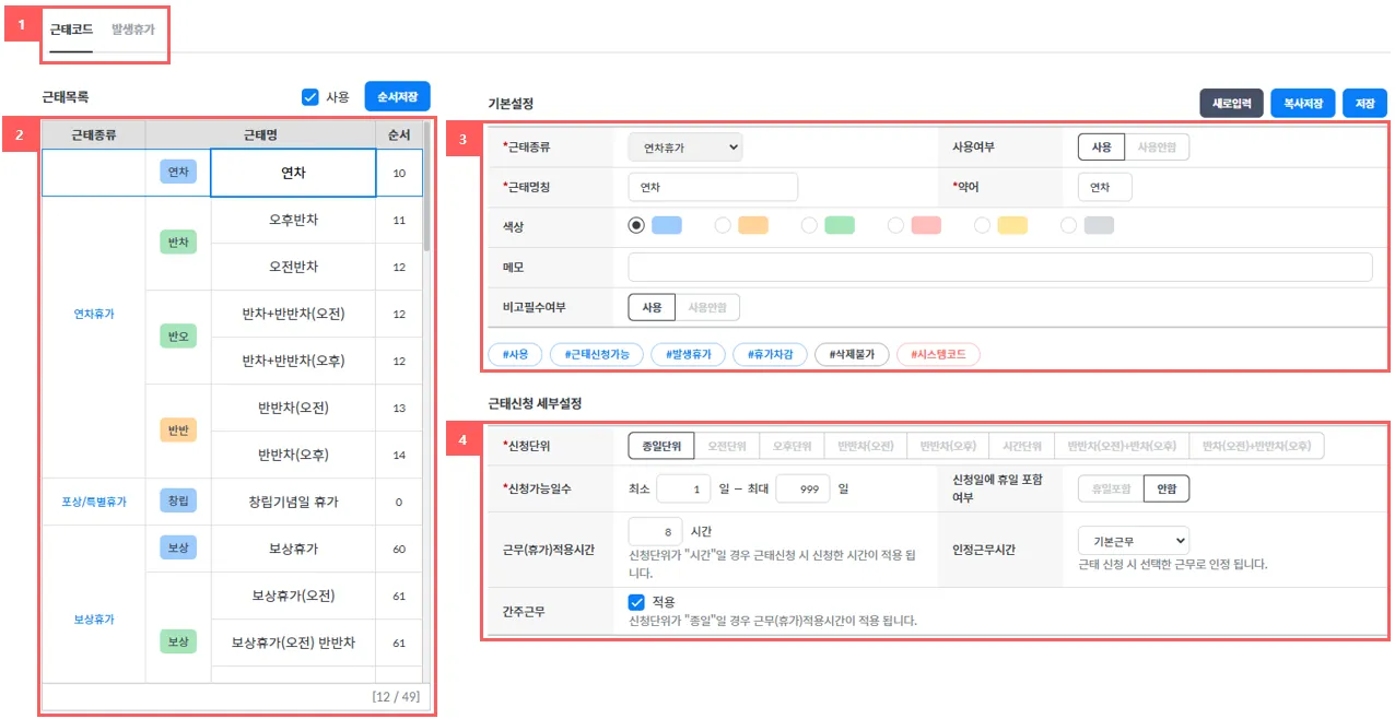 근태코드 탭 : 근태코드와 상세 내용을 설정