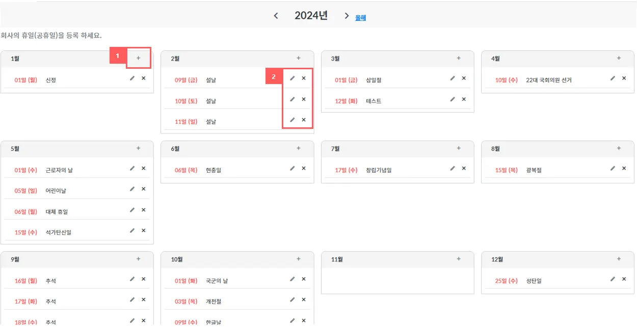 사내에서 운영하는 창립기념일과 같은 별도의 휴일들만 따로 등록 및 관리해주시면 됩니다.