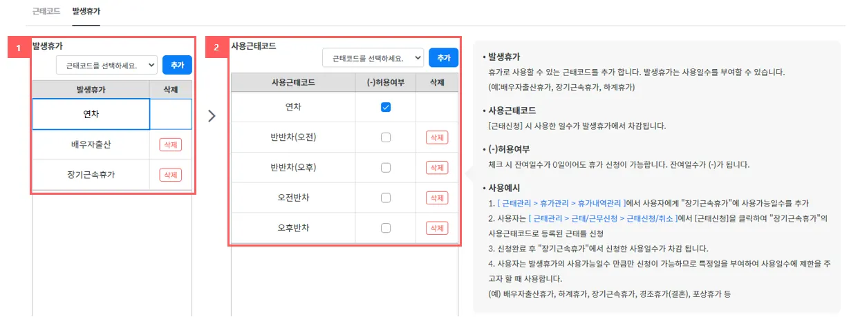 ① 생성된 갯수를 관리할 기준 근태를 등록 (ex. 연차)