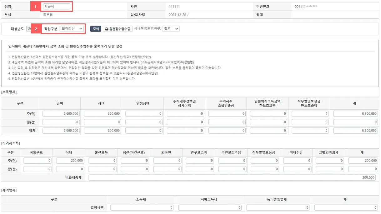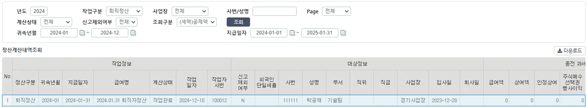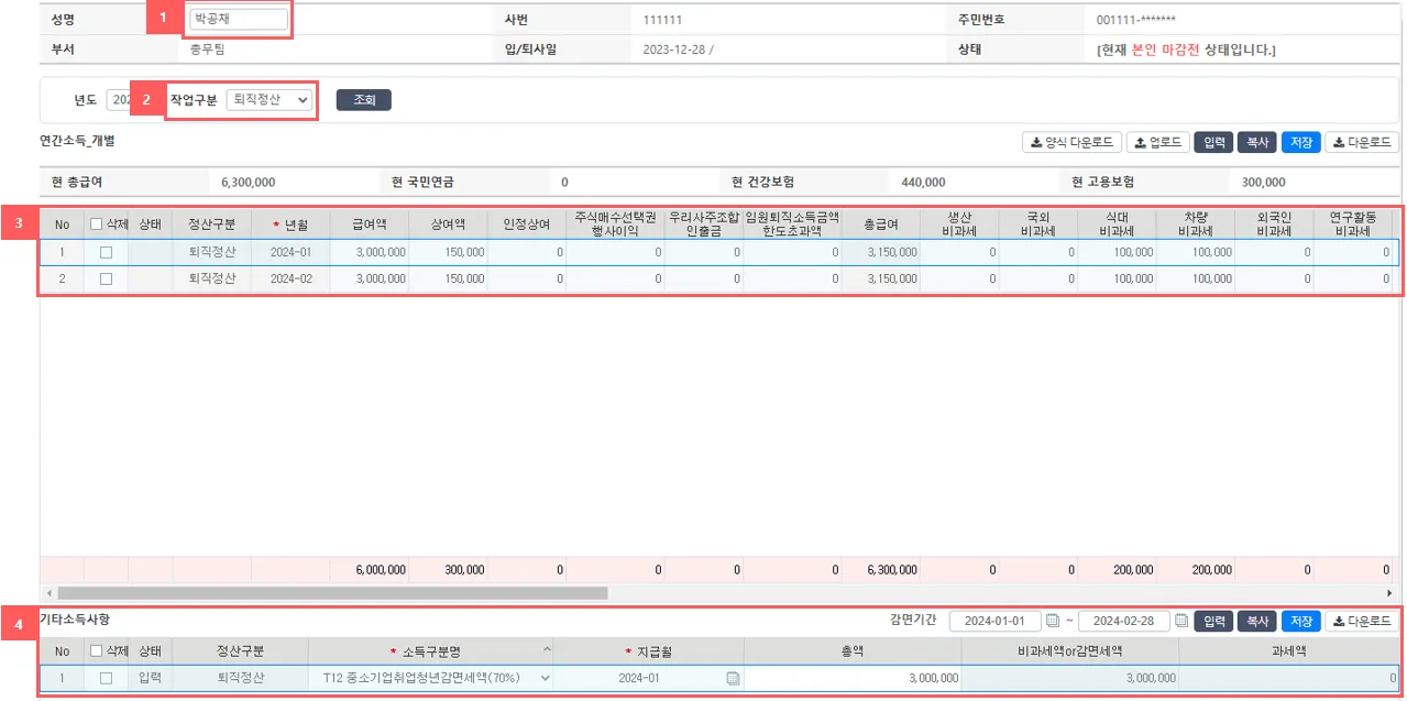퇴사한 직원들의 퇴직연말정산을 작업하는 내용입니다.