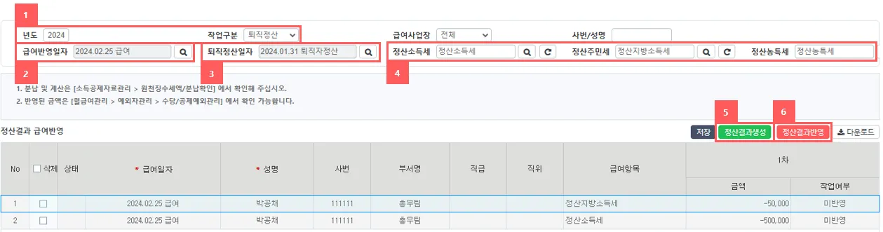 ⑤ 정산결과 생성을 통해 정산 소득세, 주민세를 생성