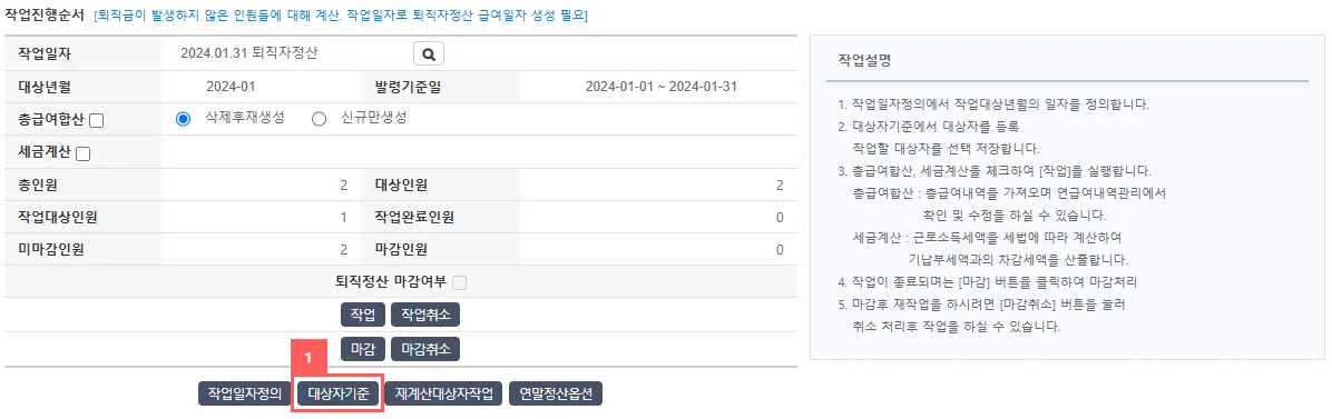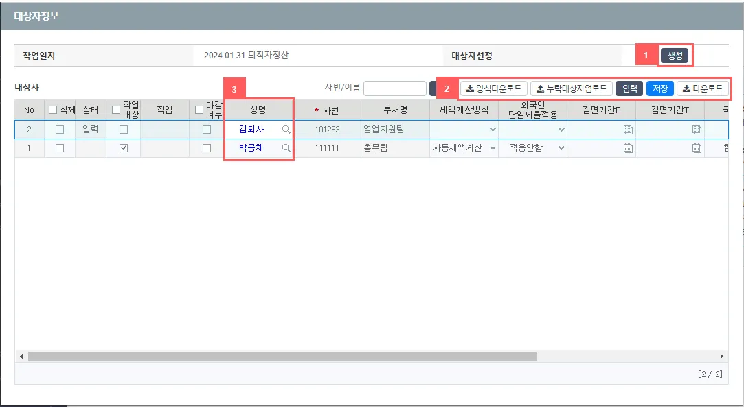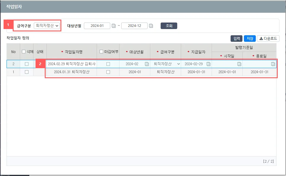 퇴직자정산 급여일자는 한 일자에 1명 혹은 그 이상의 대상자를 등록해서 사용할 수 있습니다.