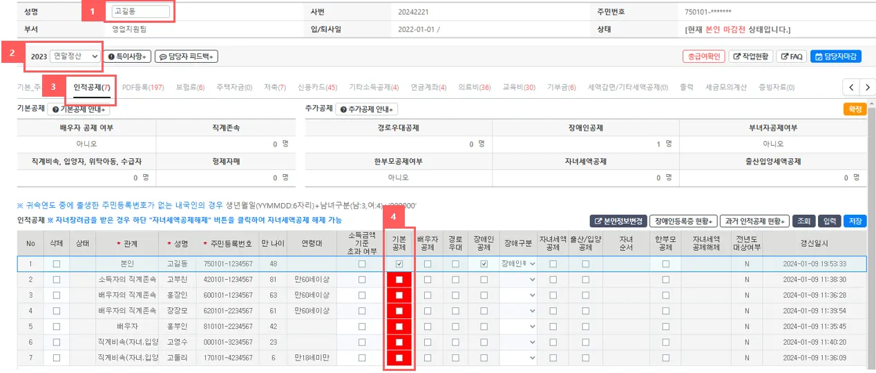 급여관리 > 귀속년도_연말정산 > 소득공제자료관리 > 자료등록(관리자) 에서 추가적인 인적공제가 필요할 경우 대상자 등록 및 공제여부 체크하시면 됩니다.
