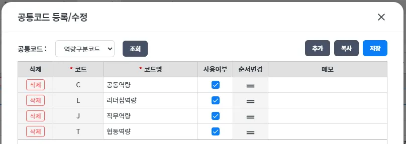 ② 역량구분 코드 추가 및 관리하는 팝업 호출