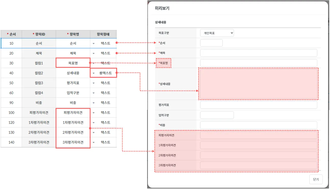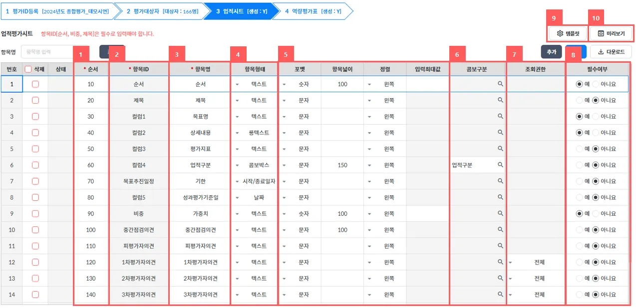 업적양식을 구성하는 화면으로 항목ID, 항목명, 항목형태, 넓이, 필수여부등을 등록 및 관리할 수 있습니다.