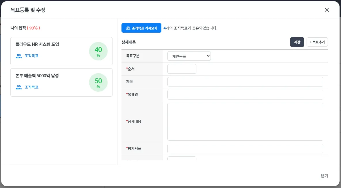업적시트에서 구성한 항목으로 목표등록 템플릿을 만든 예시입니다.