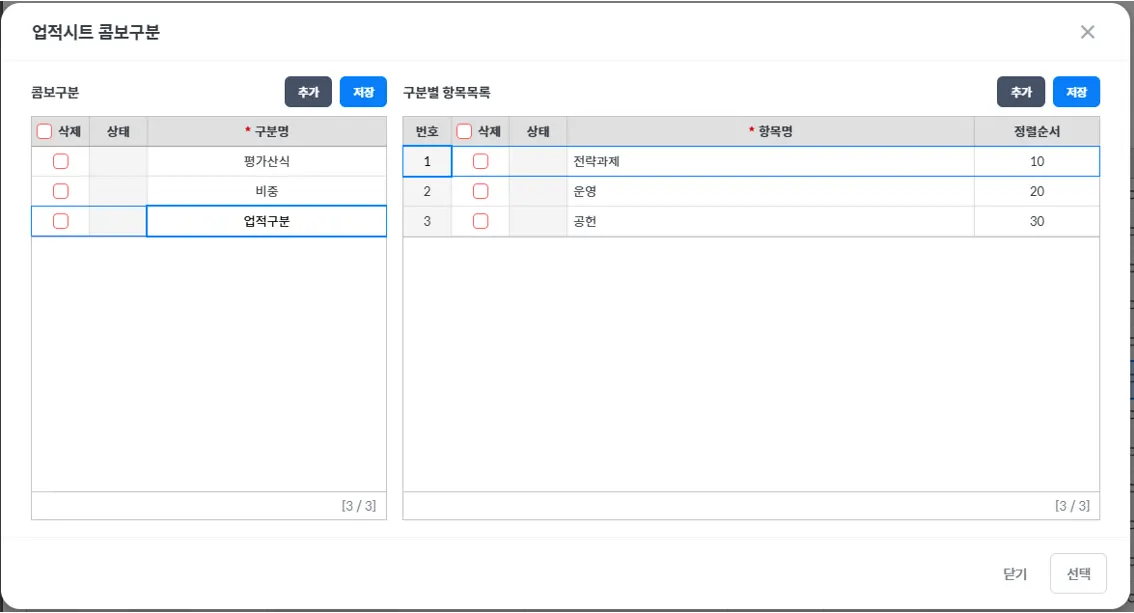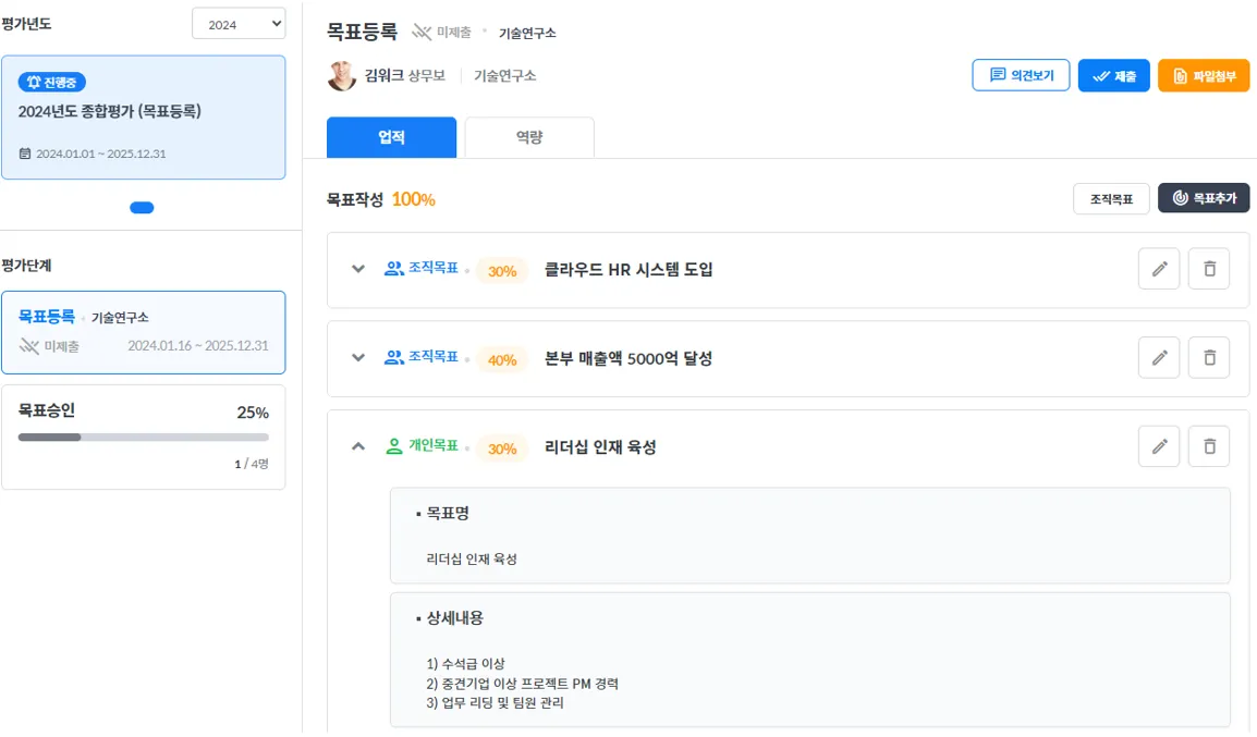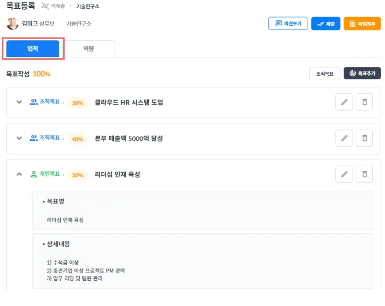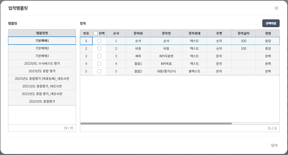 설정된 업적 양식으로 목표등록, 평가에 적용되어 구성됩니다.