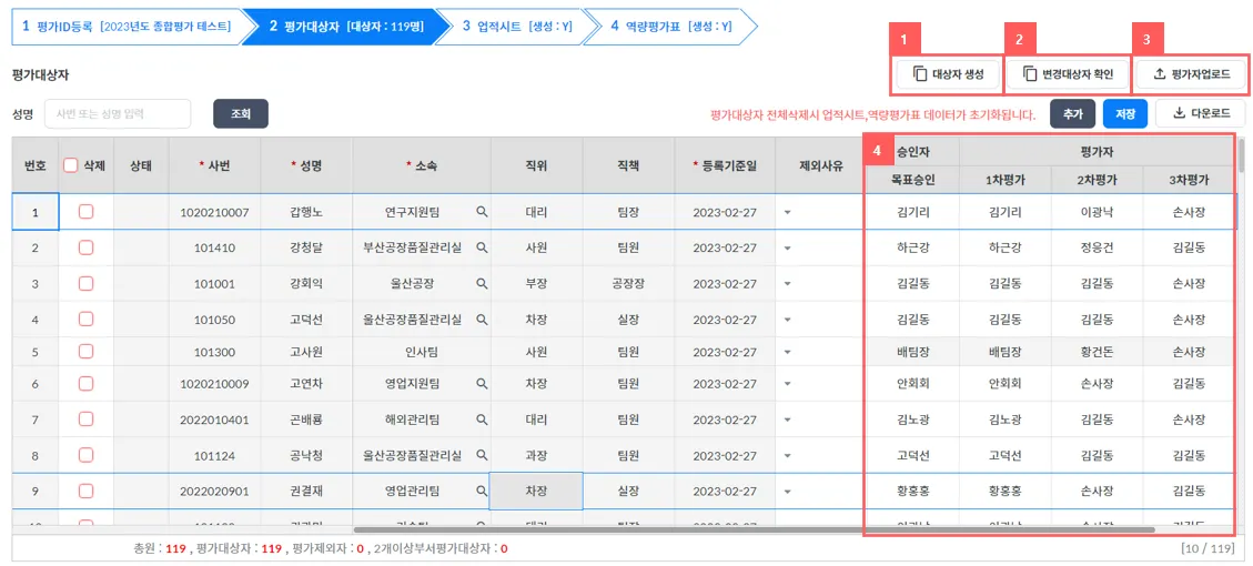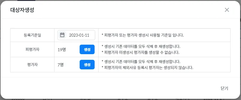 평가 대상자를 생성하는 화면으로 인사/조직을 토대로 평가자/피평가자를 일괄 생성하며 팀별 개인별 수기 변경도 가능합니다.