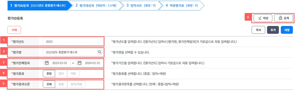 ⑥ 평가 마감과 임직원들에게 공개할지 여부를 선택