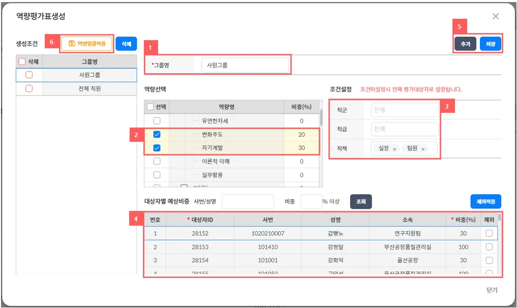 ⑥ 모든 세팅과 저장이 끝나면 설정된 대상자들에게 역량을 일괄 생성