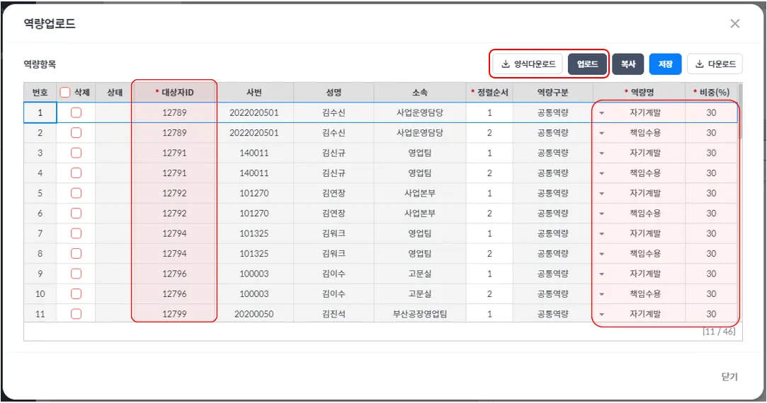 ① 대상자별 역량을 일괄 업로드 하는 팝업을 호출