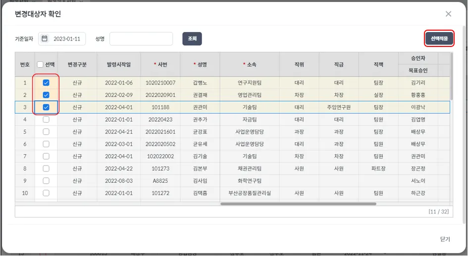 ② 목표등록 이후에 채용, 조직이동등의 대상자 추가 등록을 위한 팝업 호출